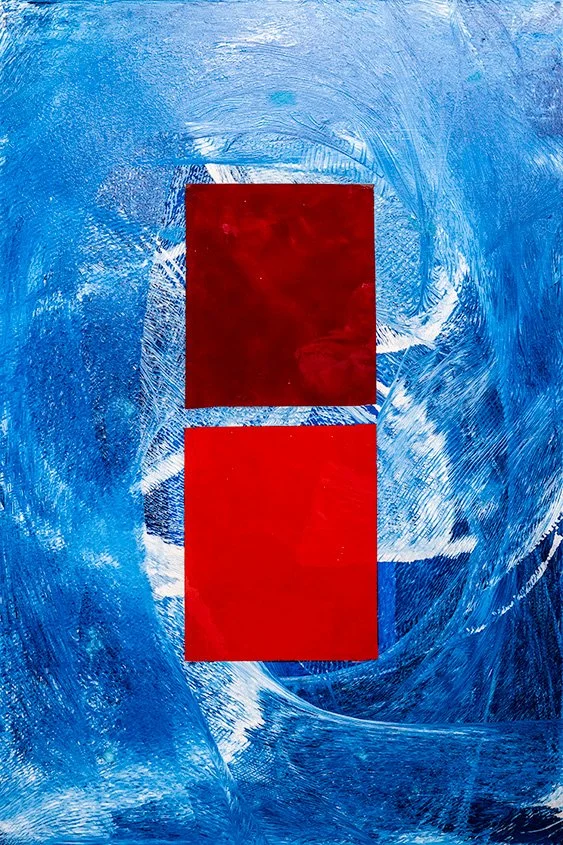 The result is a work that feels both architectural and alive, formal and emotional. The red squares embody strength, vitality, and duality, while the surrounding blues suggest both turbulence and protection, like waves that crash yet cradle.